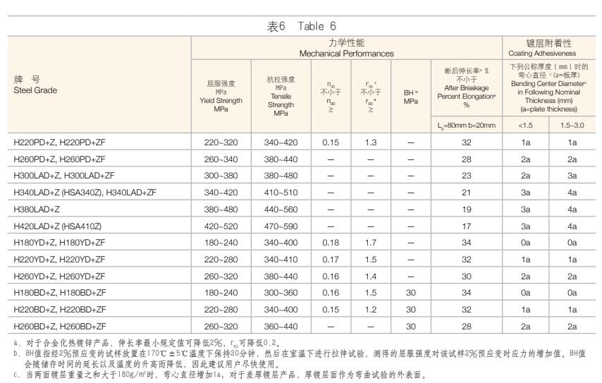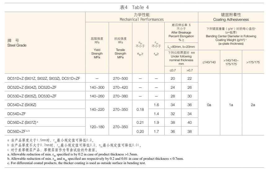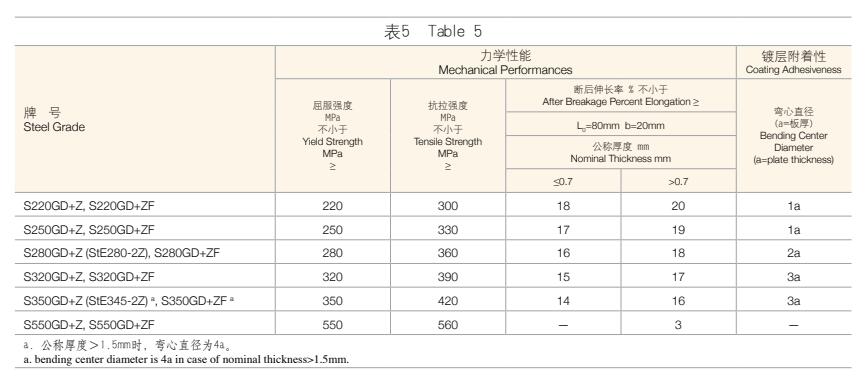 1. 鋼板及鋼帶的力學性能和鍍層附著性應符合表4、表5、表6中的規定。